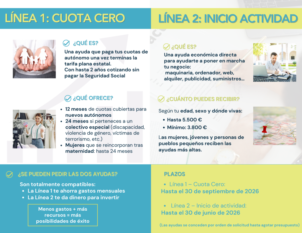 La Línea 1 – Cuota Cero cubre tus cuotas de la Seguridad Social tras la tarifa plana estatal, permitiendo que desarrolles tu actividad sin preocuparte por los pagos durante hasta 24 meses, especialmente si perteneces a colectivos prioritarios como mujeres que se reincorporan tras maternidad, personas con discapacidad o víctimas de violencia o terrorismo.